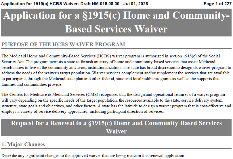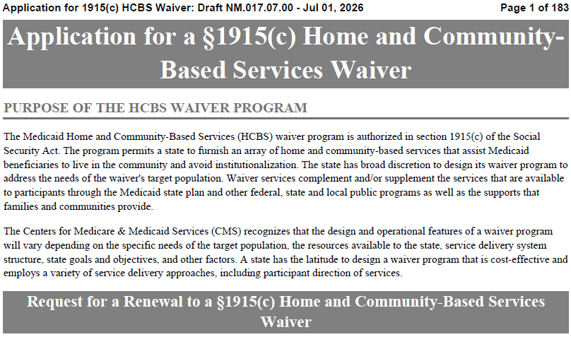 A public hearing to receive testimony on this proposed waiver renewal will be held on March 30, 2026, at 10:30 a.m., Mountain Time (MT). The hearing will be held in the Large Conference Room at the Administrative Services Division (ASD), 1474 Rodeo Rd., Santa Fe, NM 87505 and via Microsoft Teams.